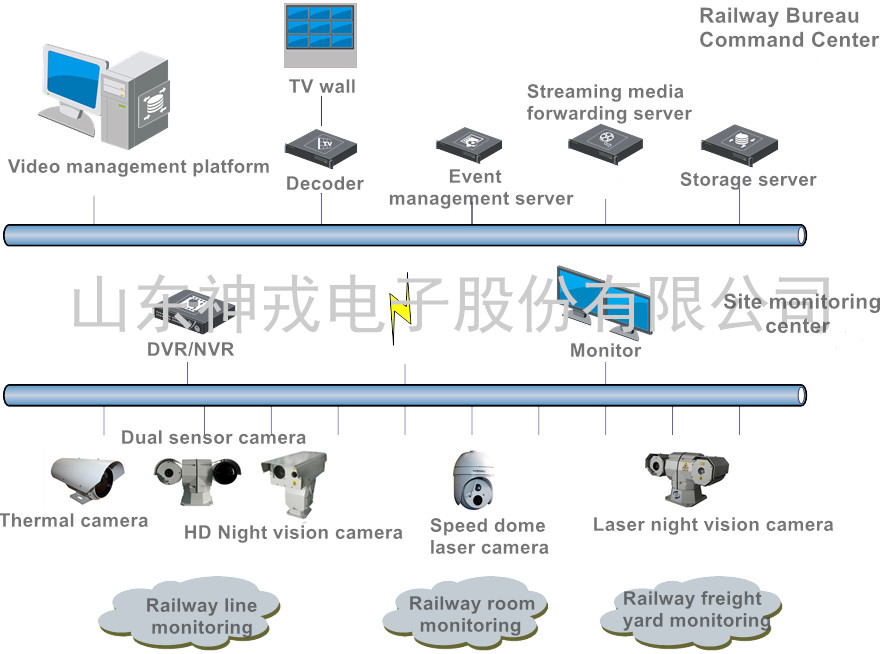 Based on the advanced laser illumination and infrared thermal imaging technology, Sheen Run has developed a railway video monitoring system.This system is based on network architecture to realize outdoor whole day video surveillance for railway(including Bridges and tunnels,thoroughfare,etc.),freight yard, machine room,etc,which can offer the railway operation & security situation in real time.When emergencies occur,the software system in monitoring center or station can provide the scene timely which record the time and place of incident,and do the alarm linkage processing.
